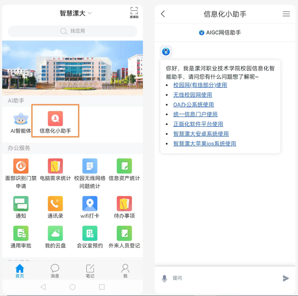 對(duì)于學(xué)生而言,AIGC網(wǎng)信助手堪稱一站式服務(wù)的最佳選擇。從一卡通使用、校園網(wǎng)登錄到學(xué)工系統(tǒng)查詢,再到智慧漯大的使用,所有校園生活的關(guān)鍵環(huán)節(jié)都得到了詳盡的指南。學(xué)生可以快速了解各項(xiàng)信息,享受便捷的校園生活。